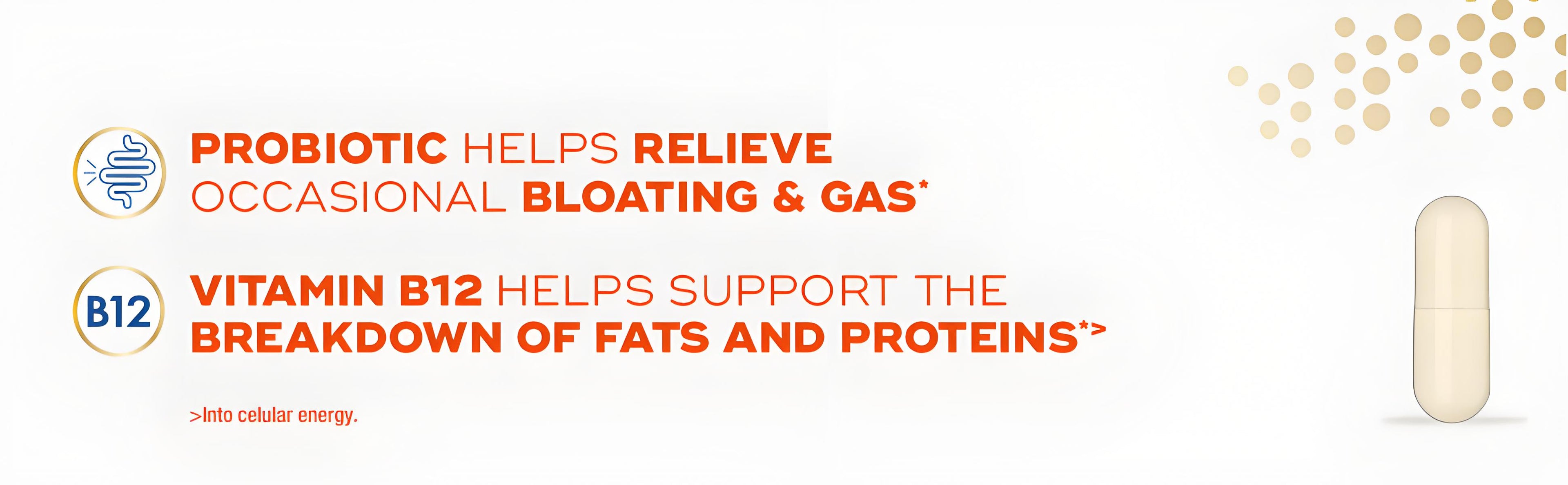 Just one capsule contains good bacteria to help relieve occasional bloating*. Vitamin B12 helps promote the breakdown of food*. Each capsule also includes a complementary, proprietary blend of 5 digestive enzymes