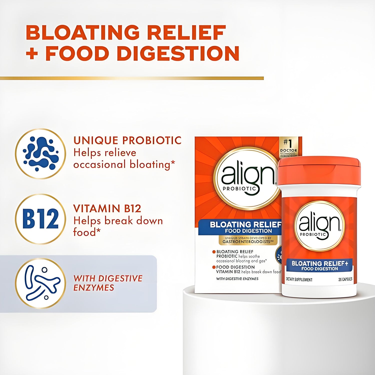 Developed by Gastroenterologists and backed by 20+ years of research; Align Probiotic contains the unique strain Bifidobacterium 35624TM and naturally helps soothe occasional abdominal discomfort, gas, and bloating.