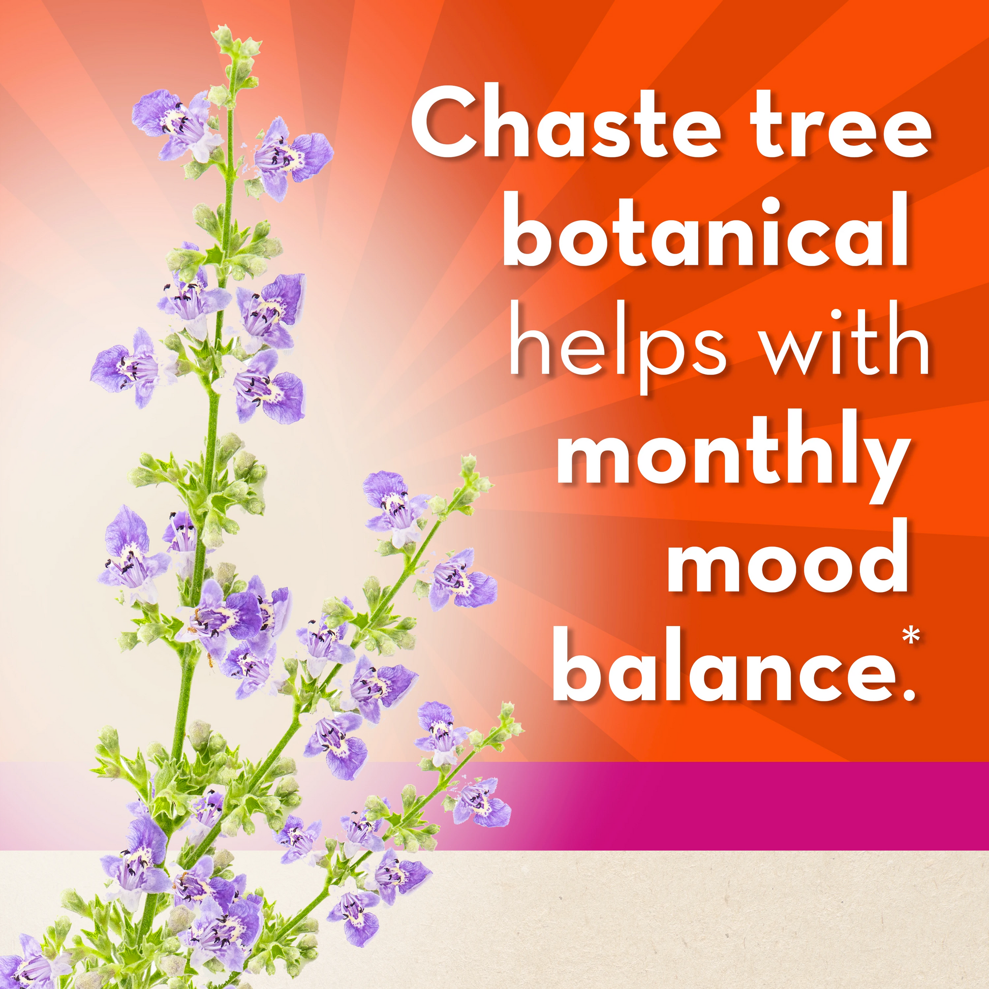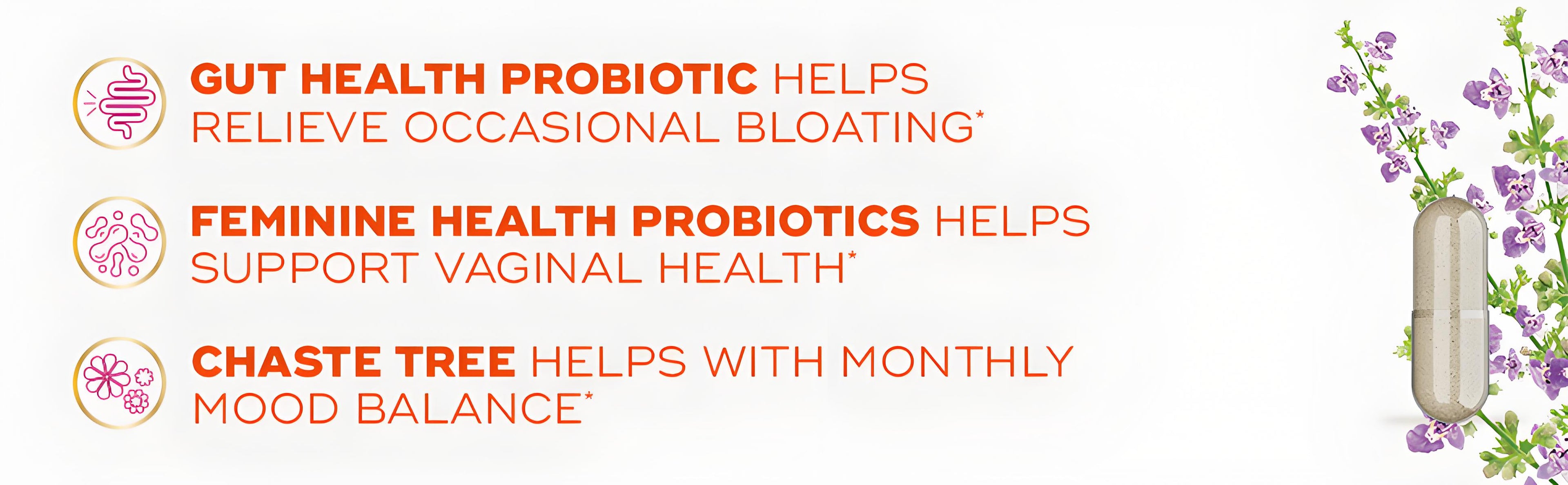 A women’s blend of probiotics with chaste tree, a botanical that helps provide monthly mood balance and helps relieve monthly bloating*